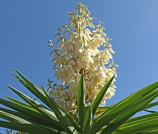 گلهای یوکا خنجری یا یوکا آلویفولیا سفید و زیبا هستند، گاهی اوقات به رنگ بنفش کمرنگ، به طوری که این گیاه به عنوان یک گیاه زینتی محبوب است. میوهها کشیده، گوشتی و تا 5 سانتیمتر طول دارند. این گیاه به طور گسترده در آب و هوای گرم و محیطهای خشک کاشته میشود.